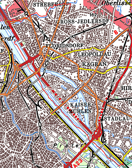 Praterbrücke und der Stadlauer Brücke, bis bei km 19 eine weitere Brücke über