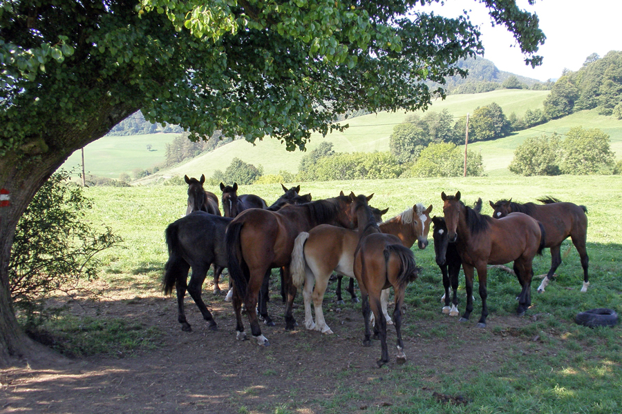 Wälder, kommen an einer Gruppe Pferden vorbei, die im Schatten eines Baumes