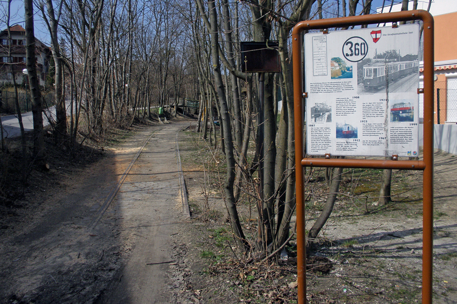 Weg erinnert eine Schautafel an die legendäre Straßenbahnlinie 360, die bis