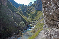nach Süden führen. Sanft geht es auf einem schmalen Steig flussaufwärts (2). Links