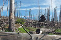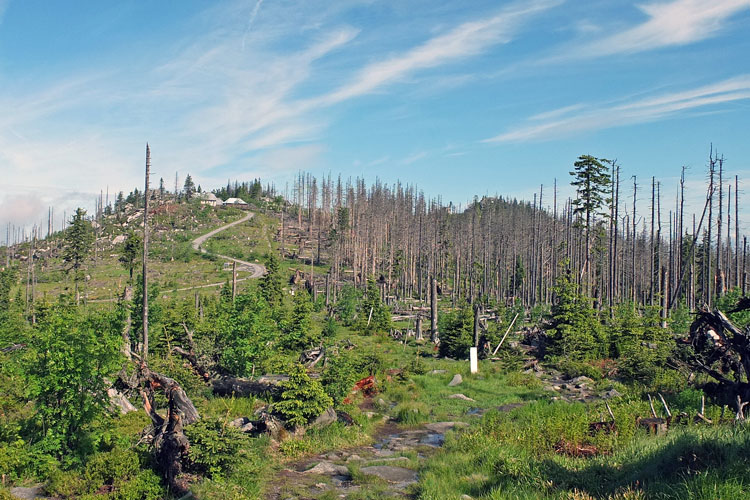 Wenn man seinen Blick aber nach Osten richtet (3), erkennt man – soweit das Auge reicht – einen vom Borkenkäfer zerstörten Wald, von dem nur mehr die Stämme kahl nach oben ragen – so ferne sie nicht vom Sturm geknickt am Boden liegen (4).