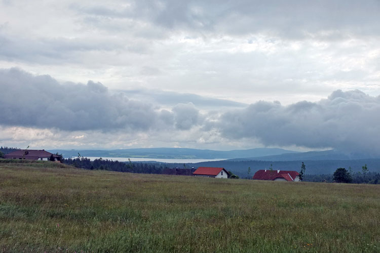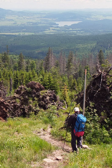 Nachdem sich der Weg genau auf der kontinentalen Wasserscheide zwischen dem Schwarzen Meer (Donau) und der Nordsee (Moldau bzw. Elbe) befindet, können wir in der Ferne den Moldau-Stausee sehen (2).