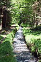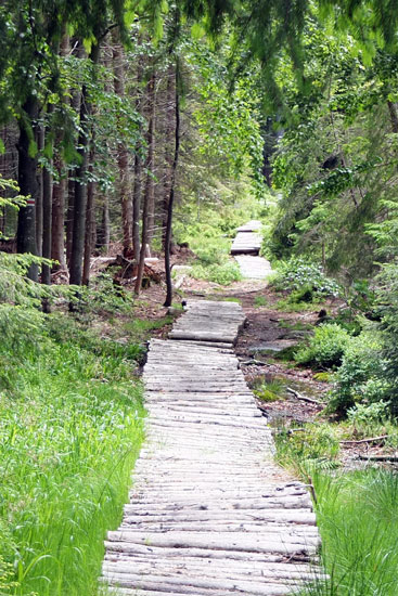 Hier ist der direkt an der Grenze entlang führende Pfad wegen der Nässe mit Holz ausgelegt, um die Wanderer trockenen Fußes durch das Quellgebiet zu führen (10).