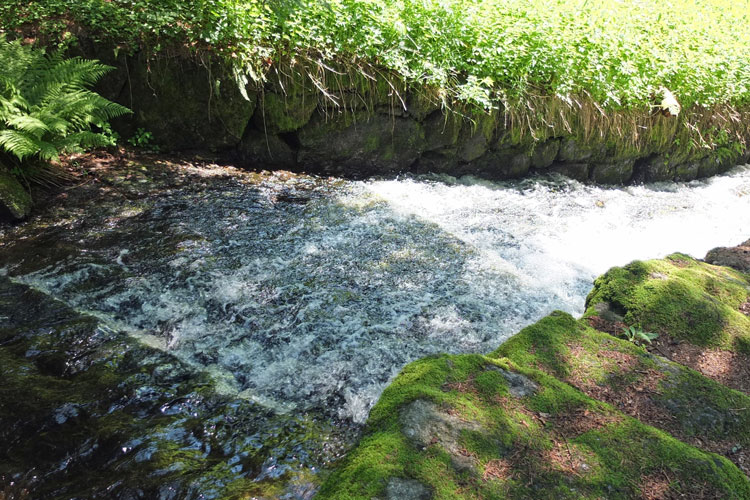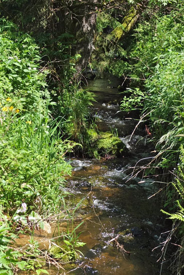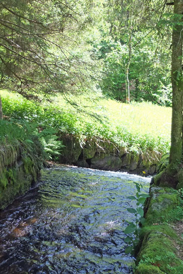 Rauschend stürzt das Wasser durch den schmalen Kanal und mit einiger Phantasie kann man sich die seinerzeitige Holzschwemme gut vorstellen (11 + 12).