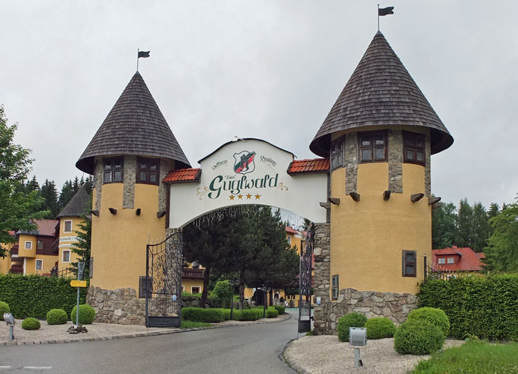 Kurz darauf schreiten wir durch das eindrucksvolle Eingangstor (4) auf das Gelände des Hotels „Guglwald“ – froh aus den nassen Sachen zu kommen und in den kommenden Stunden bis zum nächsten Tag die Annehmlichkeiten des Hotels genießen zu können.