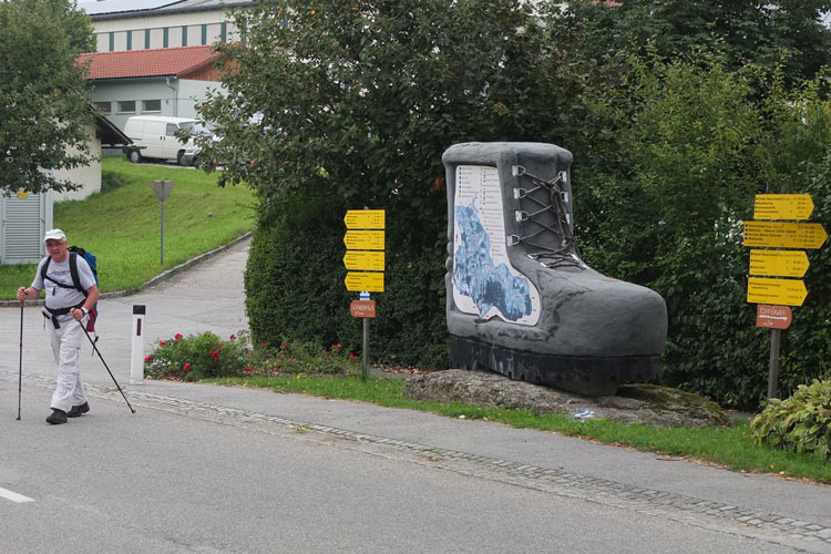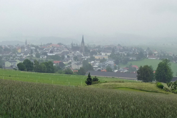 Vor uns taucht der Markt Leopoldschlag aus dem Dunst (6), den wir durchwandern und in dem wir uns bei einem markanten Wegweiser (7) orientieren.