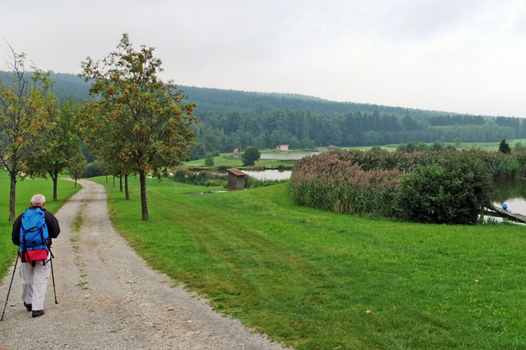 Am Beginn der 4. Etappe regnete es wieder leicht und bei trübem Wetter überquerten wir zunächst den Freibach, um dann auf einem leicht ansteigenden Weg durch den Weiler Grubhäusl nach Schönegg und weiter auf den Hirschenstein zu wandern.