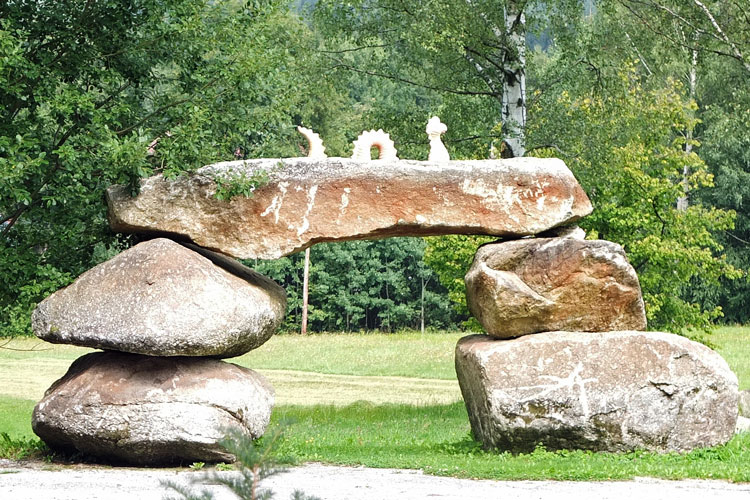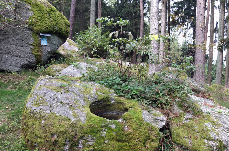 Es geht vorbei an einem kleinen Teich (8), dann durch dichten Wald zu einem Opferstein (9), in dessen kreisrunder Vertiefung sich das ganze Jahr über Wasser (bzw. Eis) befindet.