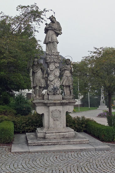 Vor der Kirche in Windhaag befindet sich ein 1731 errichteter Figurenbildstock mit dem hl. Nepomuk, flankiert von Florian und Donatus (1).