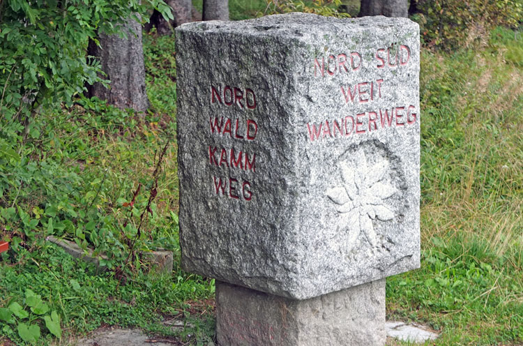 Durch einen Gedenkstein werden wir darauf aufmerksam gemacht, dass wir die Hälfte des Nordwaldkammweges geschafft haben (3).