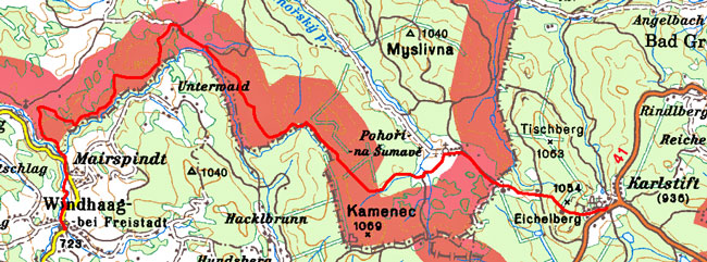Kurz danach überschreiten wir die Grenze zu Tschechien und gehen parallel zu dieser wieder in nördlicher Richtung (5), bis wir westlich von Eisenhut auf österreichisches Gebiet zurückkehren.