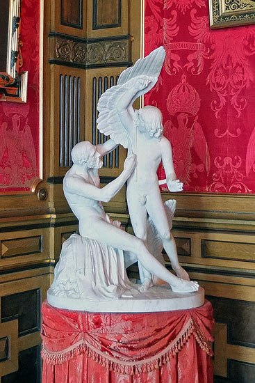 die von einem siegreichen Soldaten und von zwei Näherinnen flankiert wird,