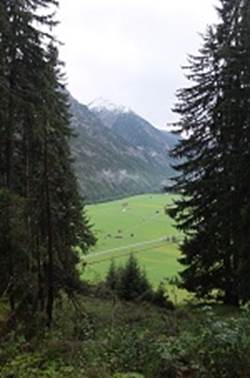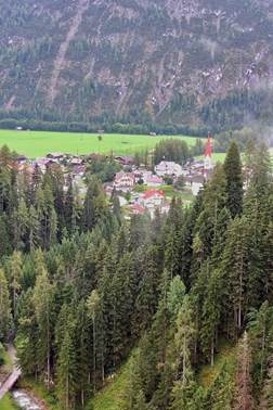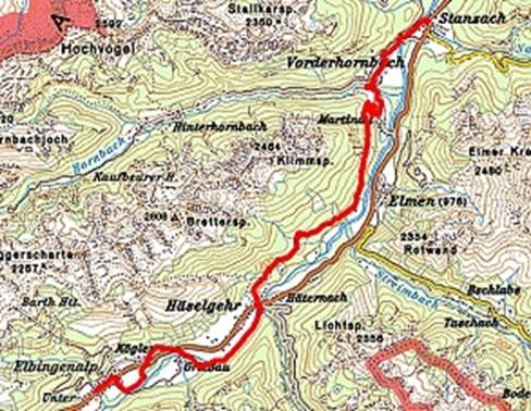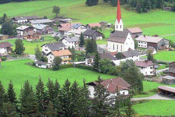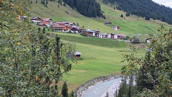 Serpentinen ins Tal, wir genießen einen schönen Ausblick auf den Weiler Martinau und gelangen nach Vorderhornbach. Dies war noch vor wenigen Jahrzehnten