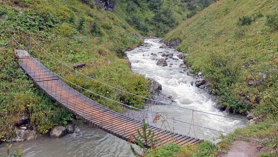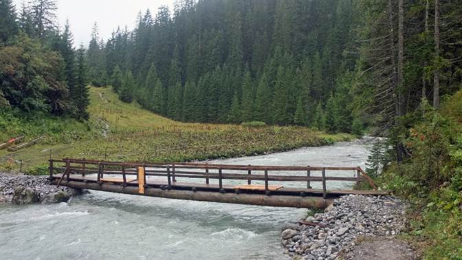 Warth überqueren wir auf einer kleinen, rutschigen Hängebrücke den Krumbach und gelangen dabei von