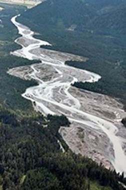 Schotterbänken gesäumter, stark gewundener Flussverlauf.