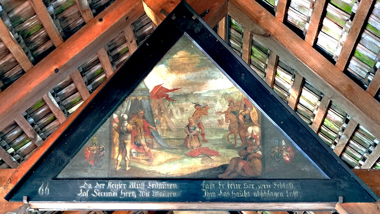 ebenfalls restaurierten Gemälde befinden sich wieder im Giebel der Brücke.