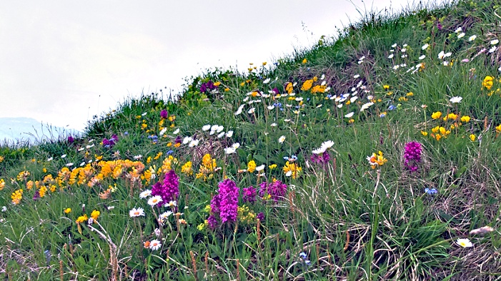 blühende Almwiesen säumten den Weg und die Trasse der Zahnradbahn (6).