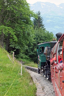 Tal an der Weißen Lütschine liegt. Hier steigen wir in die Wengeralpbahn um, eine 1893 erbaute Zahnradbahn, die uns