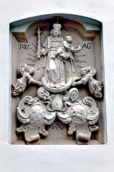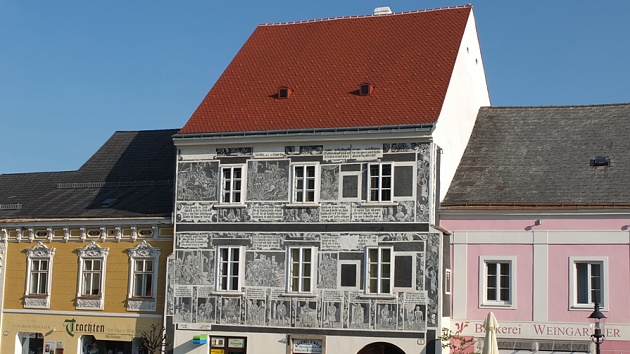 das Haus Rathausplatz 4, an dem sich schöne, aus der Zeit um 1580 stammende Sgraffitomalerein befinden.