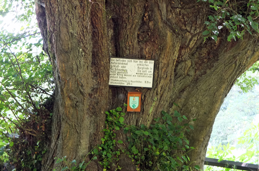 Nach einem kurzen, steilen Anstieg erreichten wir die Ruine Schaunberg, vor deren Eingang eine mehr als 700 Jahre alte Linde zu bewundern ist.