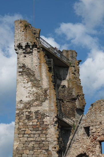 Über eine Metalltreppe mit 190 Stufen kann der noch erhaltene Rest des Bergfrieds erstiegen werden. Von oben hat man einen guten Überblick über die gesamte Burganlage, vor allem auf die gegenüberliegenden Reste des „Palas“, einem repräsentativen Saalbau, von dem aber nur mehr wenige Mauerreste stehen.