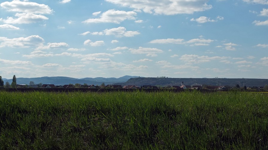 Jetzt befinden sich links und rechts des Kamps große, ebene Ackerflächen und in der Ferne kann man die Berge des Dunkelsteiner Waldes und des Waldviertels erblicken.
