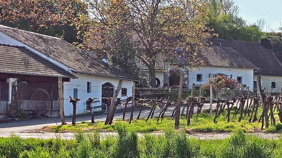 Kurz danach erreiche ich den Bahnhof von Hadersdorf am Kamp, der am Fuß des Wagrams inmitten von Weingärten und gegenüber Weinkellern liegt.