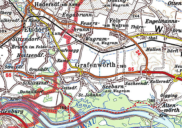 weitere 2,5 km stromaufwärts gehen. Hier befindet sich eine Brücke über das künstliche Gerinne (hier nur mehr mit dem Wasser der Krems) und auf einer Strasse, die durch die Au nach Grafenwörth führt, erreiche ich nach 1,7 km wieder den Kamp.