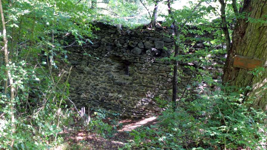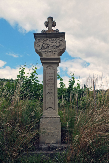 Ein alter Wegweiser zeigt mir den weiteren Weg und ich folge ab hier dem Kamptal – Weitwanderweg, erkennbar an seiner neu angebrachten Markierung, einem weißen und einem blauen Strich, über denen ein blauer Punkt angebracht ist.