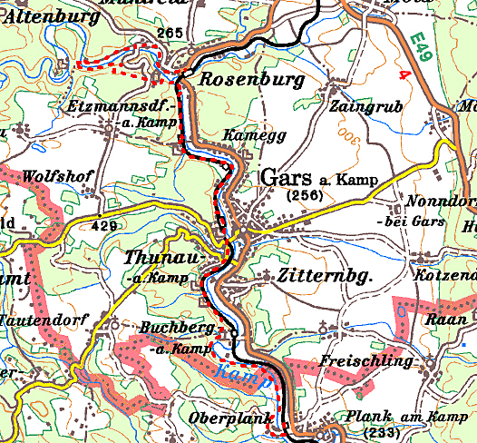 In unmittelbarer Nähe überwindet auch der Kamp die letzten Höhenmeter, die ihn von der Donau trennen.