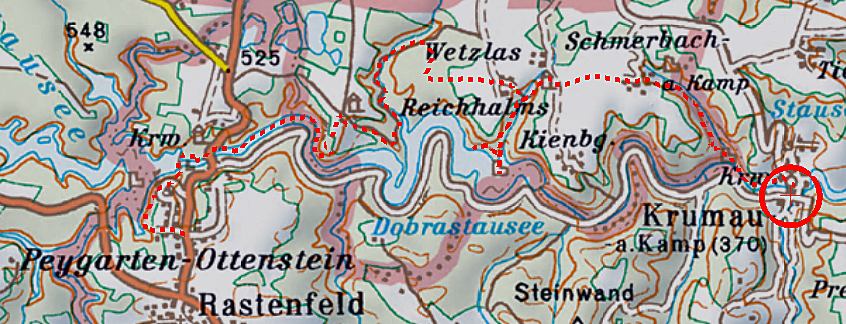 ich zunächst wieder auf kürzestem Weg zum Kamp gehe. Bei Diendorf überquere ich den Fluss und gehe am Ufer entlang in den Ort Hadersdorf am Kamp.