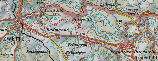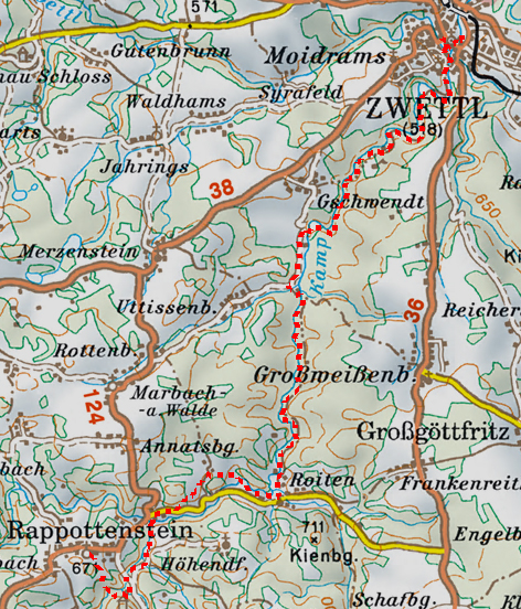 Hausmühle wieder den Kamp zu überqueren. Nach einem kurzen Anstieg passieren wir Arnreith und sehen schon