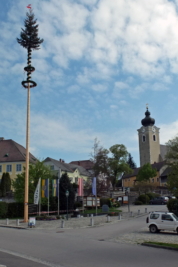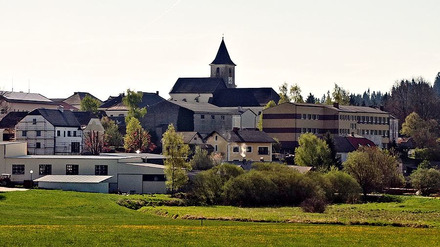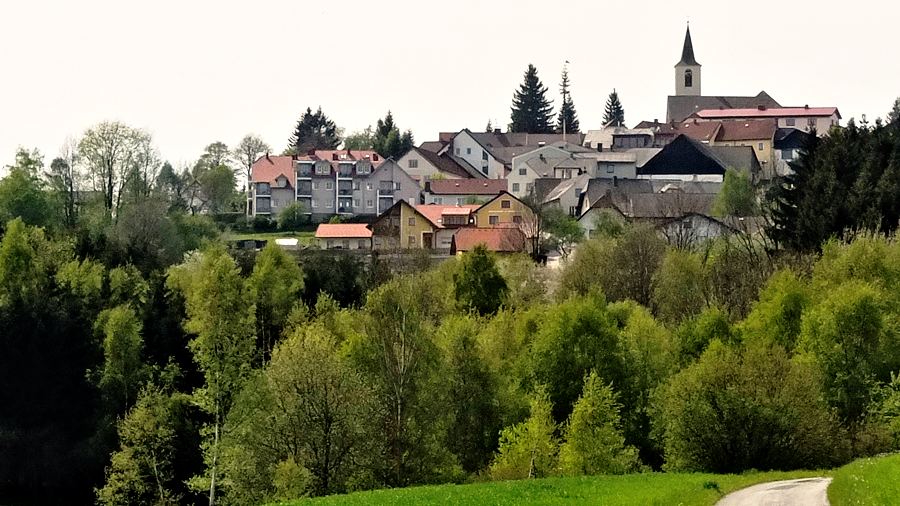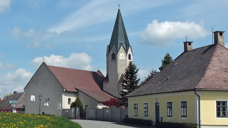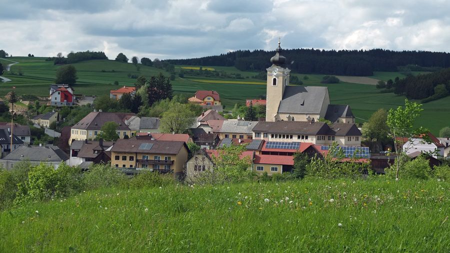Auf der Anhöhe vor uns erblicken wir schon den Kirchturm von Kirchschlag, den wir um die Mittagszeit erreichen.