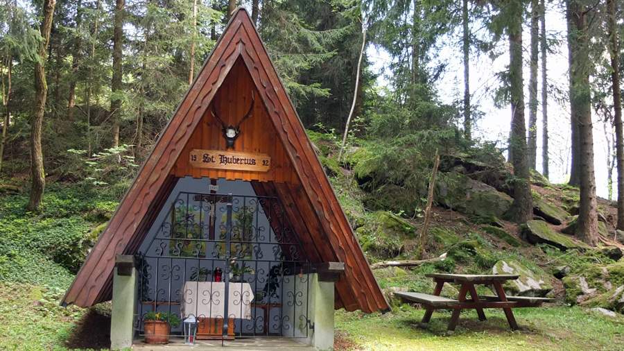 Waldpassage, die uns in südöstlicher Richtung an der Hubertuskapelle vorbei zur Schmalzau und
