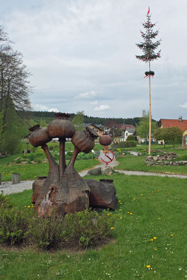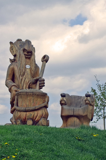 Am Betriebsgelände befindet sich auch eine Holzfigur, die wohl an den Erfinder der Waldviertler Whisky-Rezeptur erinnern soll – oder stammt die Figur doch aus der Serie „Asterix & Obelix“?