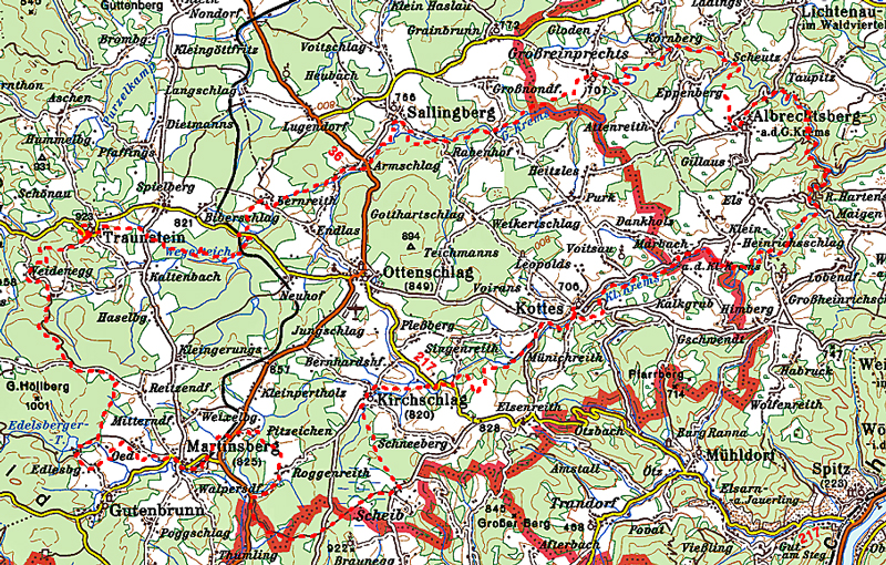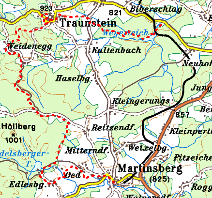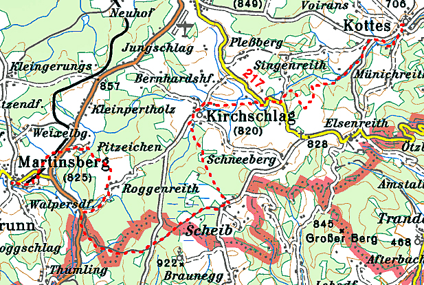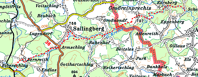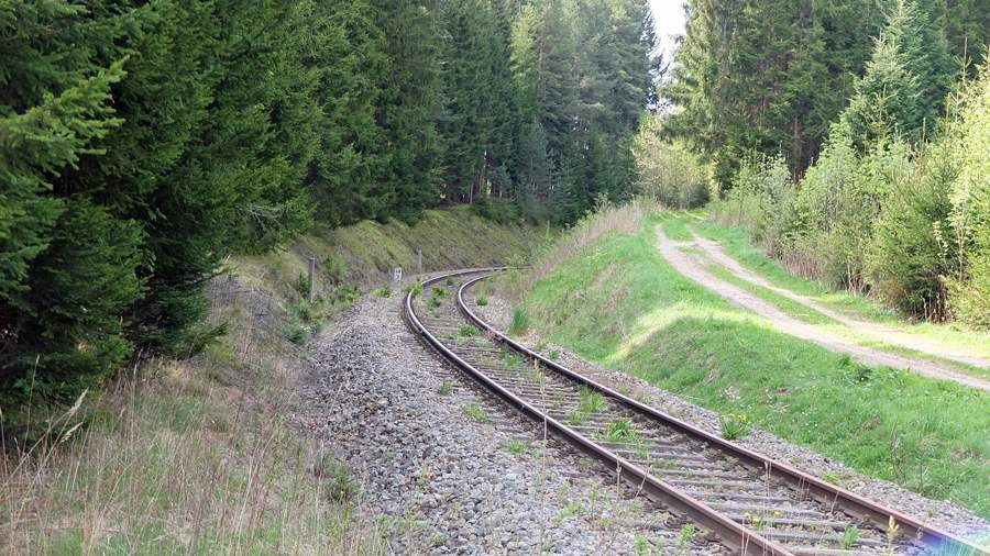 nach Pitzeichen, wo wir nochmals auf die Bundesstrasse 36 stoßen. Unmittelbar neben der B 36 liegen die Gleise der schon seit 1986 für den Personenverkehr und ab 2010 auch für den Güterverkehr eingestellten Bahnlinie von Zwettl nach Martinsberg, denen wir die letzten 2 Kilometer bis zu unserem heutigen Ziel, Martinsberg (825 m), folgen.