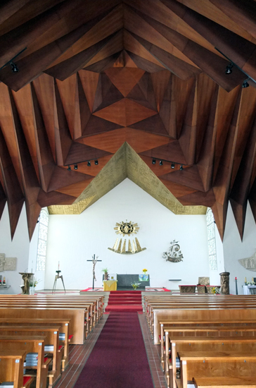 Wachtstein). Bei einem Besuch der in der Mitte des 20. Jahrhunderts erneuerten und vergrößerten Pfarrkirche Traunstein können wir das neue Kirchenschiff bewundern, in dem auf Stützpfeiler vollständig verzichtet und welches mit einer eindrucksvollen Faltdeckenkonstruktion aus Holz versehen wurde.