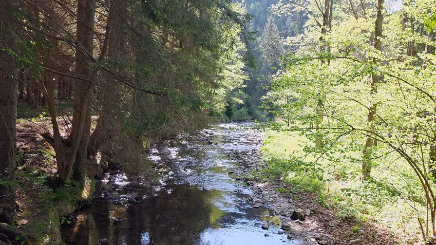 flussaufwärts, bis wir beim Gasthof Bauer wieder über den Fluss gehen.