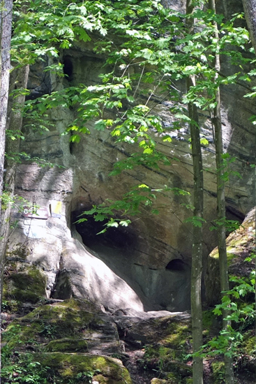 ..... und am Fuße des Felsens die Gudenushöhle, in der ca. 70.000 Jahre alte Funde einer Besiedlung durch Neandertaler