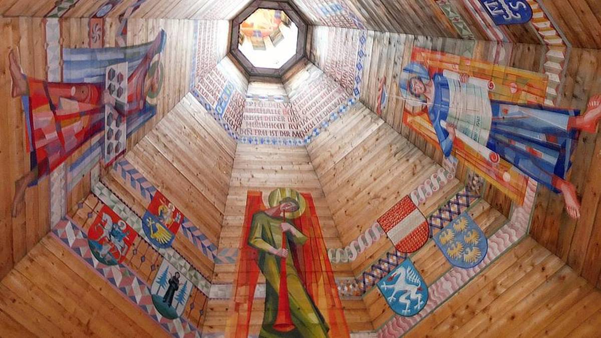 Dachkonstruktion ist mit zahlreichen Figuren und Inschriften verziert. |