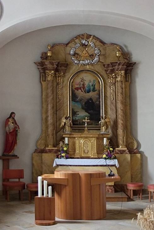 Die vor der Kirche stehende Dreifaltigkeitssäule stammt aus dem Jahr 1713.