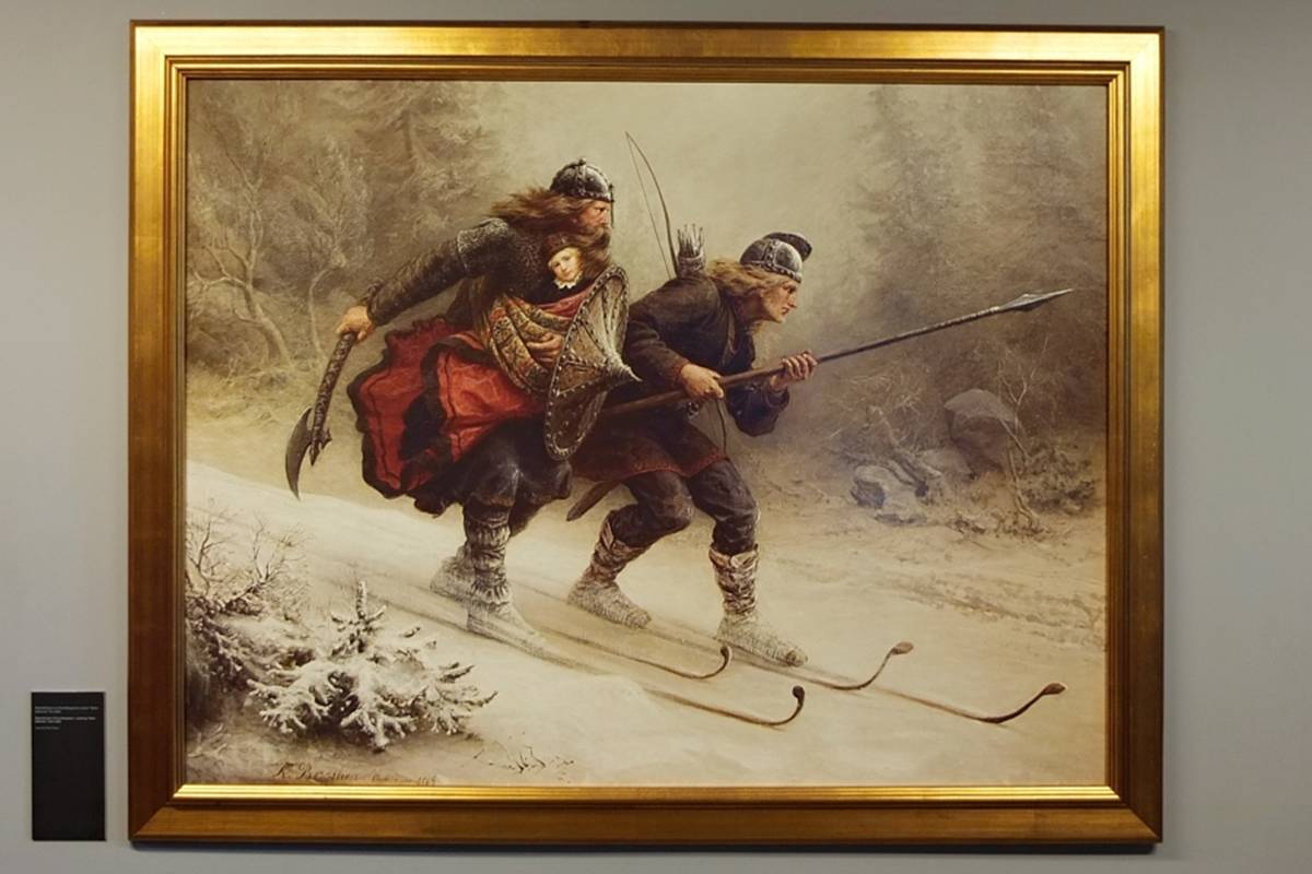 Skilaufs. Darunter auch dieses Gemälde „Die Birkebeiner“
