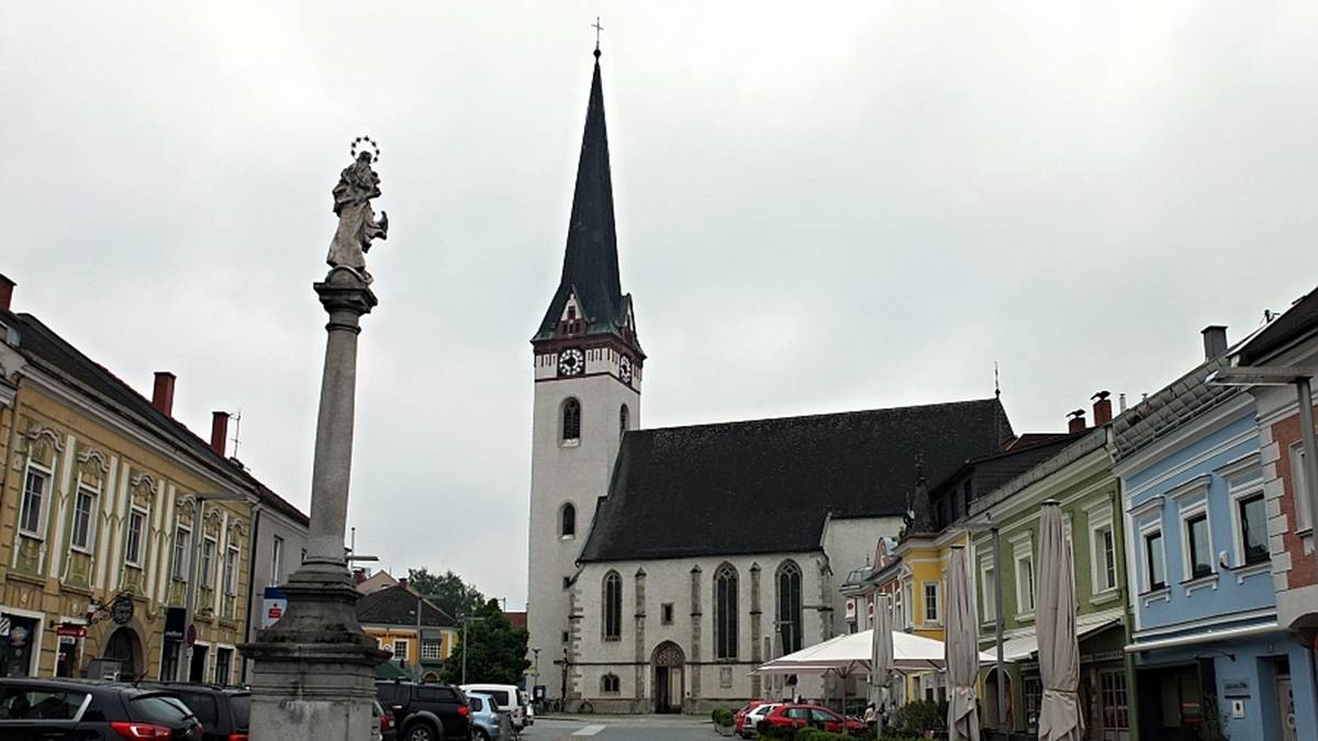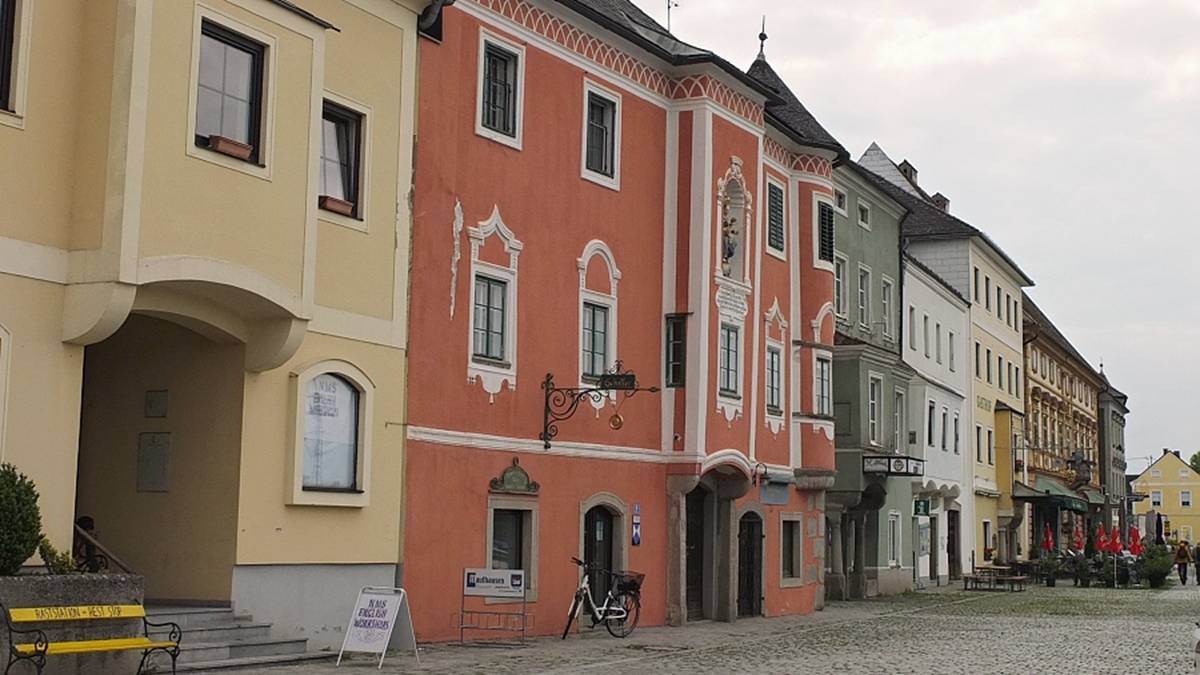 befindet sich am höchsten Punkt des Hauptplatzes, der sich zur Donau hin