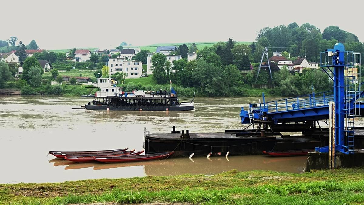 wieder ans Ufer der Donau, wo wir gegenüber von Mauthausen mit der Fähre …