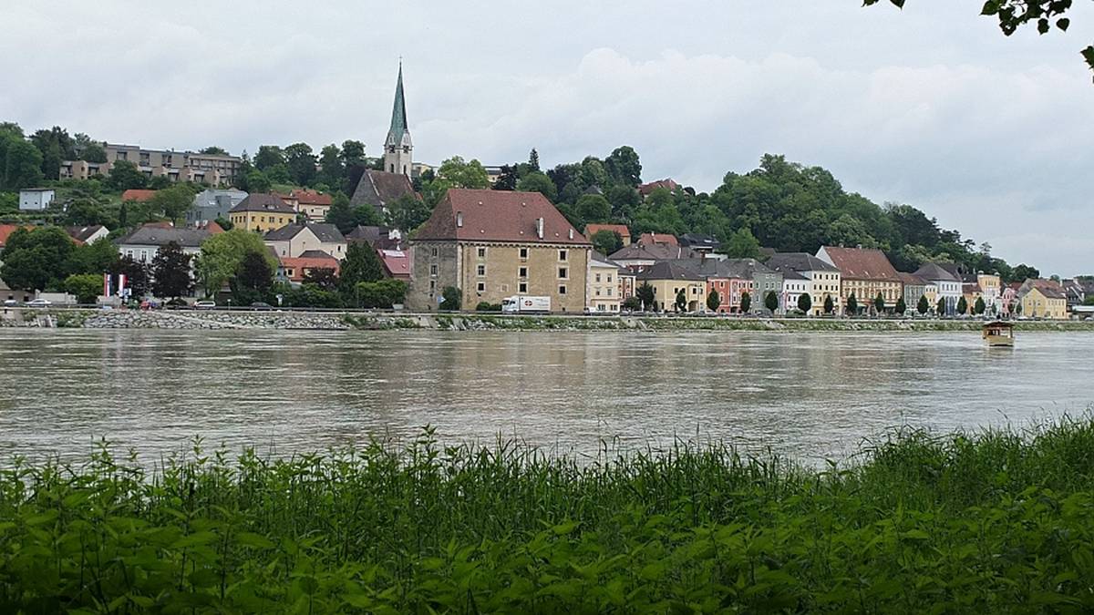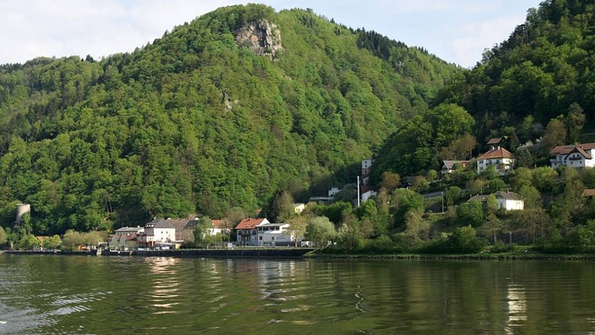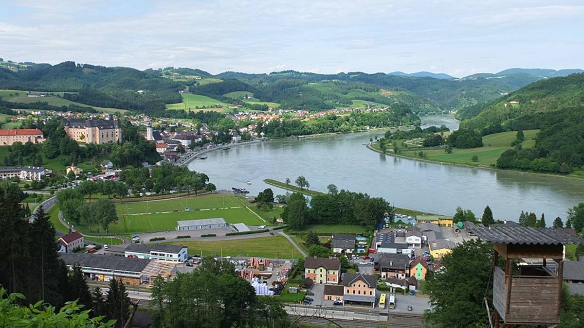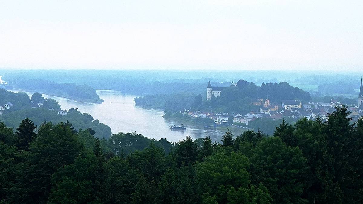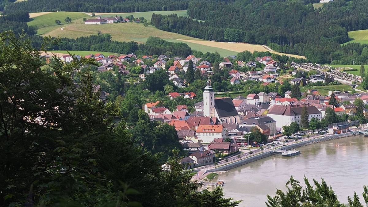 Mitterkirchen und am gegenüberliegenden Ufer der Donau die Kirche von Wallsee,