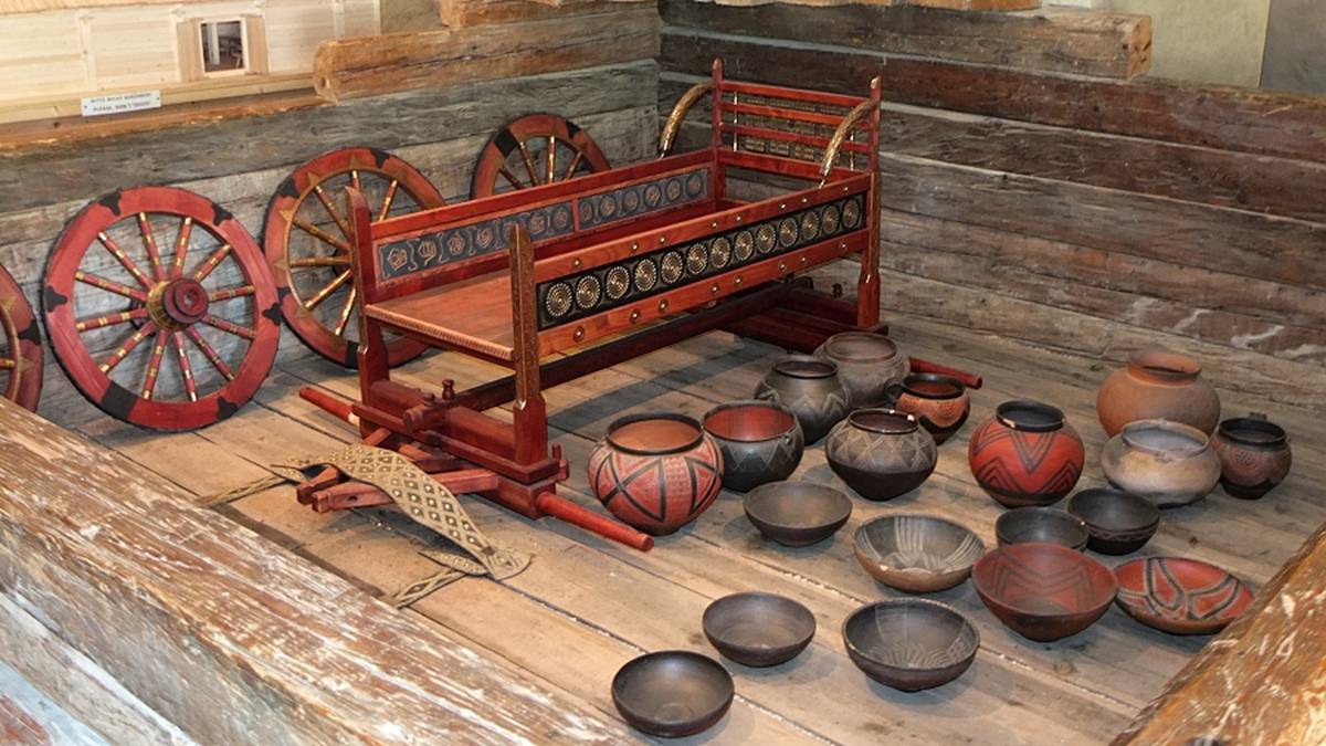ein rekonstruiertes Hügelgrab mit zahlreichen Grabbeigaben.