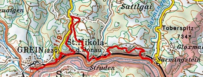 wir hinunter nach St. Nikola an der Donau und sehen im Hintergrund schon das