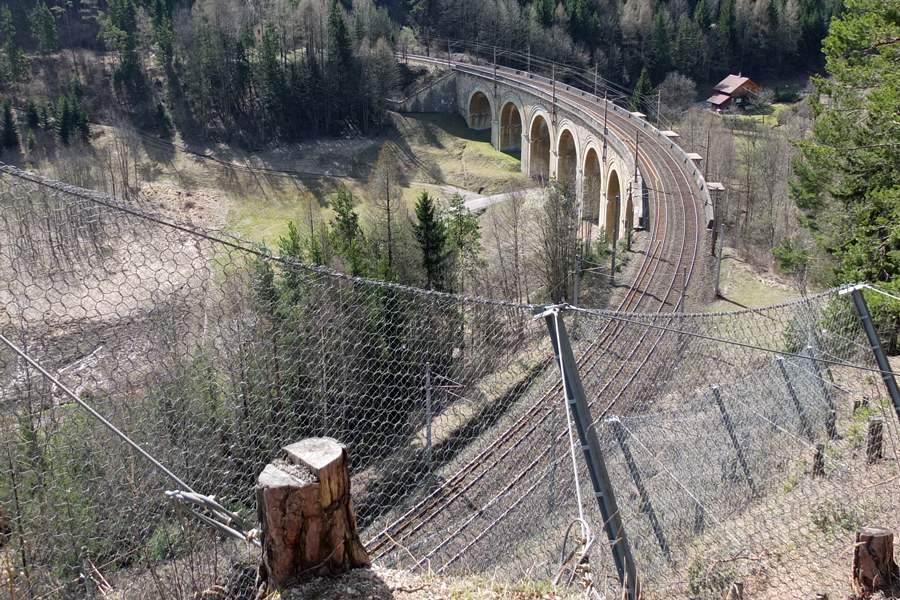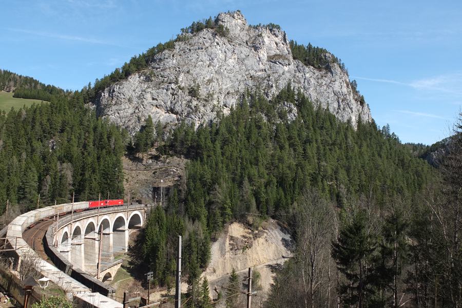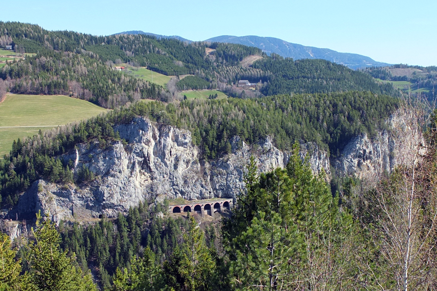 Wolfsbergkogel mit seinem berühmten 20-Schilling-Blick auf die Felsen der Pollereswand und die Südbahntrasse, die hier (v.r.n.l.) zunächst durch den nur 14 Meter langen Krausel-Tunnel, dann über das 87 Meter lange und 34 Meter