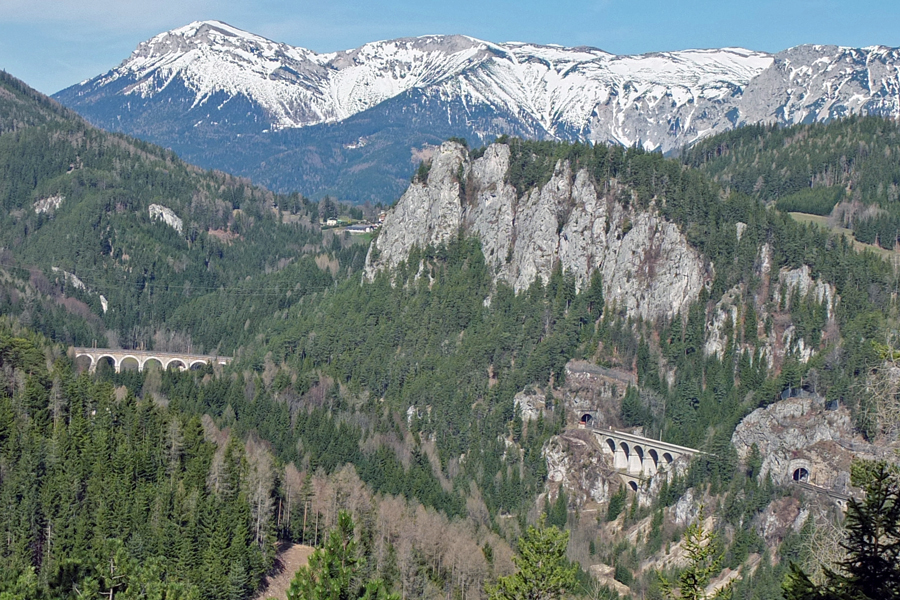 Doppelreiterwarte liegt die Weinzettelwand, die von der Südbahn mit 3 Tunnel