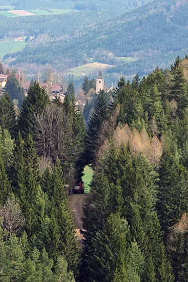 über den Kienberg, von wo man schon die Kirche von Klamm erblicken kann.